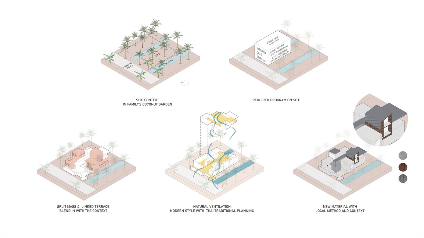 Địa điểm xây dựng ngôi nhà là một vườn dừa gần chợ nổi ở Samut Songkhram, Thái Lan và cũng là nơi nổi tiếng với dịch vụ du thuyền trên sông để ngắm đom đóm. Từ những ngày còn bé, thu nhập chính của gia đình chủ nhà đến từ công việc buôn bán dừa trên chợ nổi của người mẹ. Sau này khi đã có thu nhập khá hơn, gia chủ muốn xây riêng một ngôi nhà để mẹ nghỉ ngơi và dành thời gian bên con cháu.