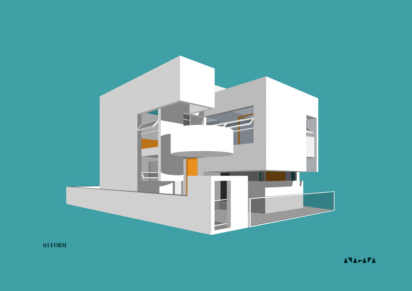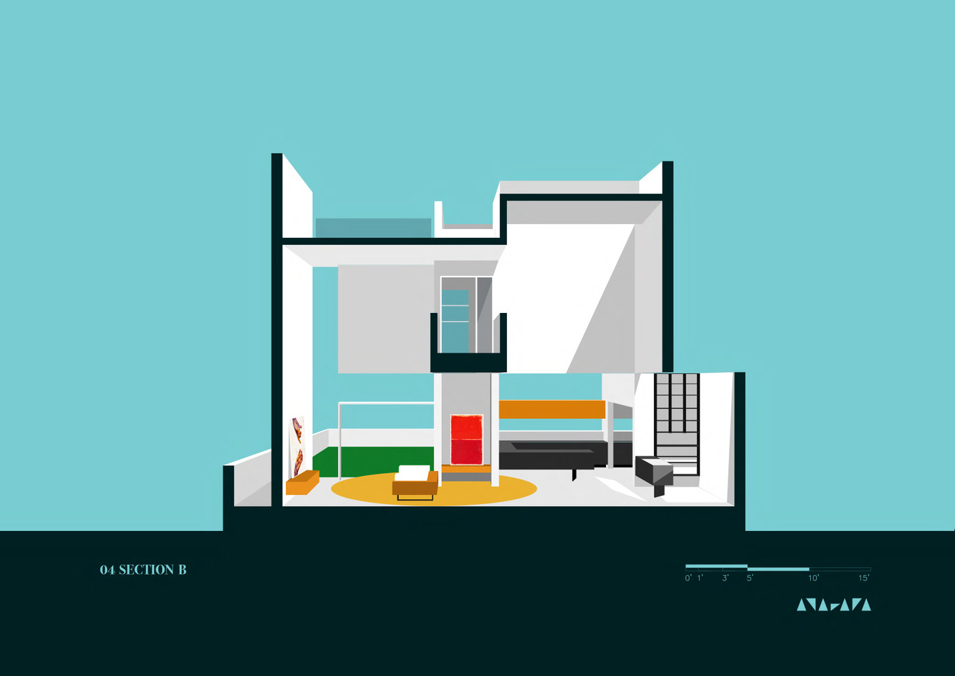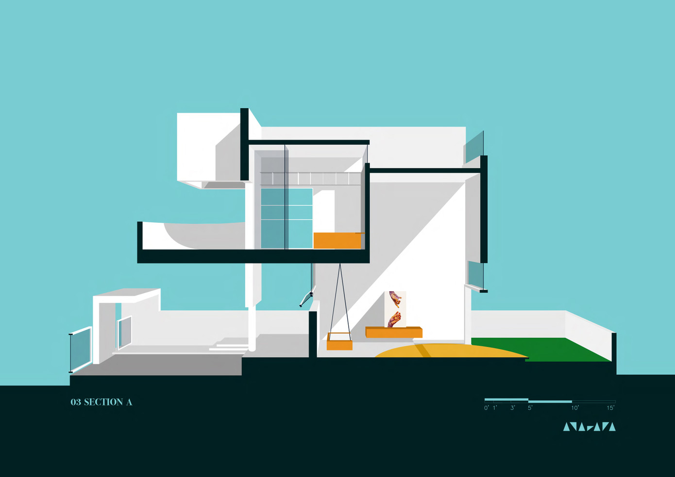 Khối tròn này có chức năng là không gian sinh hoạt ngoài trời dưới dạng ban công. Khối tròn được phản chiếu vào phòng khách bên trong, nơi nó chuyển thành một hoạ tiết sàn với hình tròn màu vàng nổi bật.