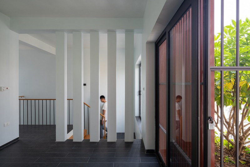 Thay vì xây gạch kín mít, những bức tường dạng lam sắp xếp theo chiều dọc để gió có thể di chuyển từ phòng này sang phòng khác.