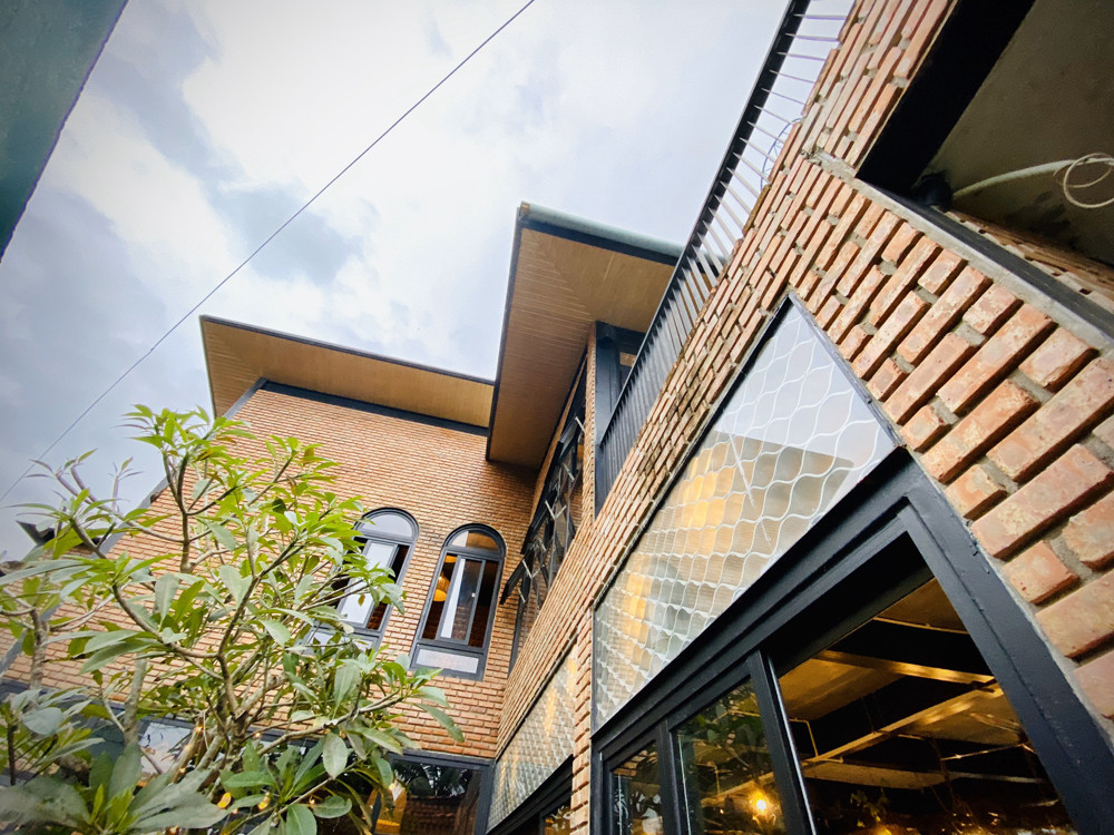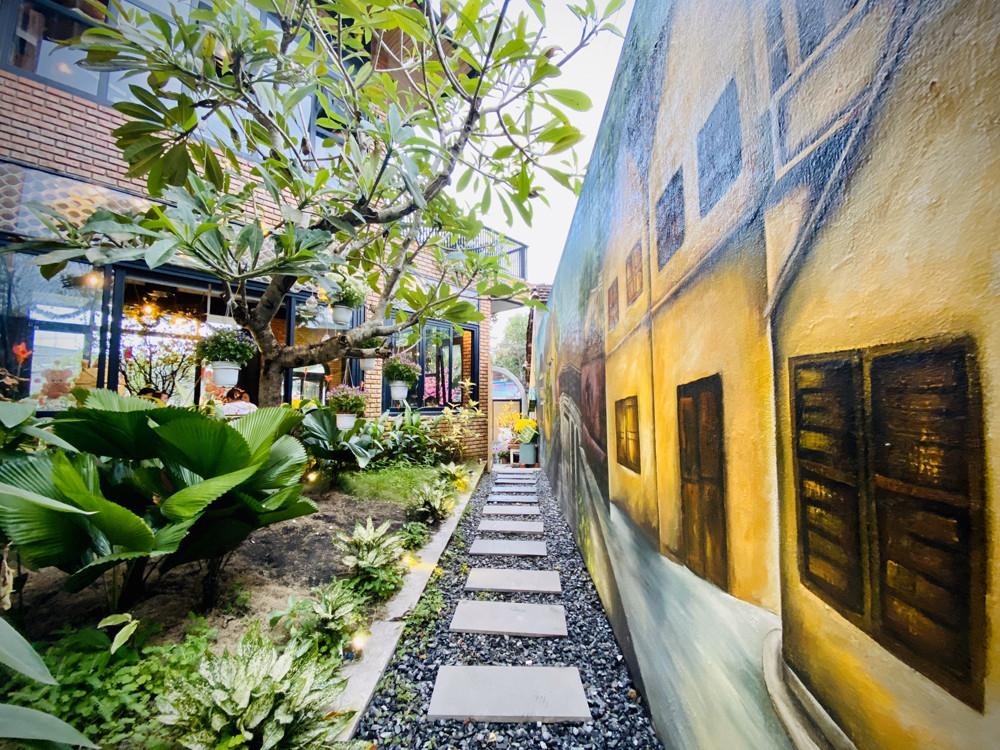 Tận dụng bức tường của nhà hàng xóm kiến trúc sư cho vẻ vào đó 1 dãy phố cổ Hội An làm điểm nhấn ẩn hiện cho khách bên trong quán nhìn ra góc sân vườn tạo cảm giác như đang ngồi giữa lòng di sản.