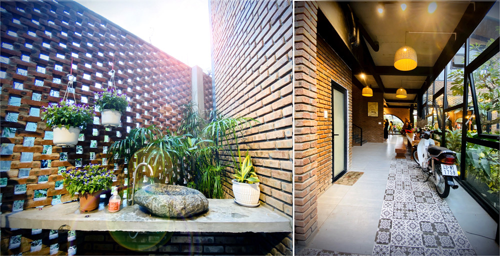 Nơi rửa tay cho khách, cũng được xếp gạch so le tạo khoảng thông gió, và khóa nắng tạo ra tia sáng len lõi, để trồng cây xanh làm thơ mộng cho chỗ rửa tay. Ảnh: Nice World Architecture.