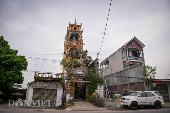 Cổng ngôi nhà được chạm trổ với những hình thù "kỳ quái" nhưng được anh Tưởng lý giải do anh ảnh hưởng từ cha - một thợ điêu khắc nên từ nhỏ anh Tưởng đã đam mê nặn, vẽ. Tới những năm trung học cơ sở, anh thường mang giá vẽ đến các đền, chùa rồi bị cuốn vào lối kiến trúc, tượng, linh vật... lúc nào không hay. Năm 2004, anh Tưởng vừa học, vừa làm điêu khắc tại làng gốm Bát Tràng, sau đó làm cho một xưởng gốm Giang Tây (Trung Quốc). Từ đây, anh đi qua nhiều nước Đông Nam Á vừa học, vừa làm trong lĩnh vực hội họa, điêu khắc, phong thủy.