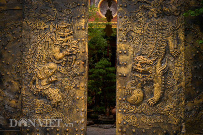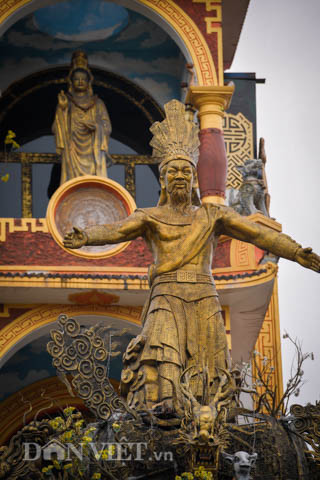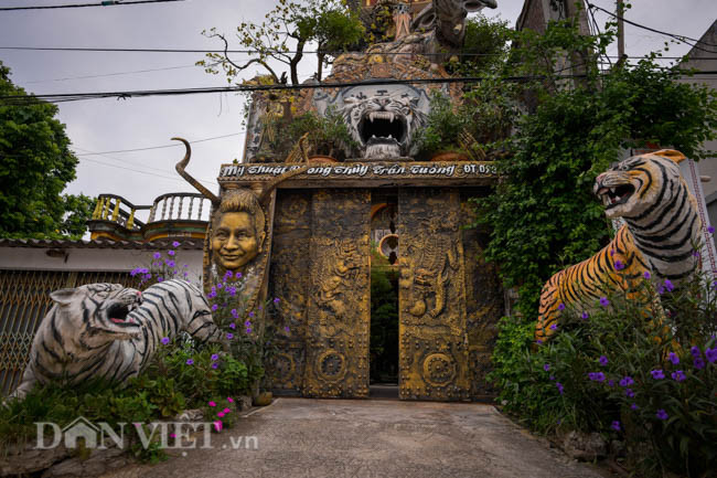 Bên dưới đặt tượng hổ, dần lên là sư tử, trâu, tượng Phật Quan âm, cao nhất là tượng vua Hùng cách mặt đất hơn chục mét. Ngay cổng, chủ nhân còn tạc một bức chân dung khuôn mặt mình.
