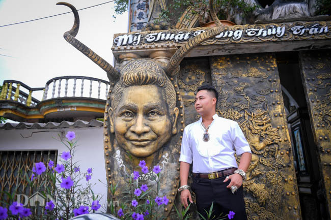 "Tôi tuổi trâu nên đã đặt tượng trâu trước cửa nhà từ năm 2013. Sau này tôi nâng trâu lên cao, cưỡi lên cánh chim ưng. Hiện tại, tượng trâu đang cưỡi lên đầu sư tử. Phía trước thì tôi tạc một bức phù điêu mặt mình có gắn 2 sừng như sừng trâu", chủ nhân ngôi nhà đặc biệt cho hay.