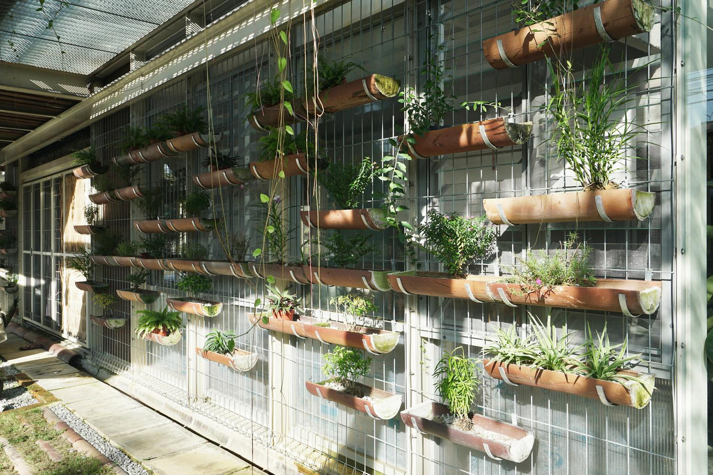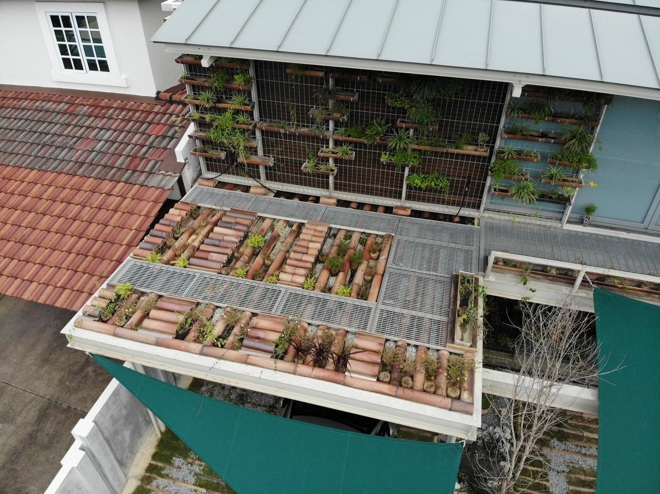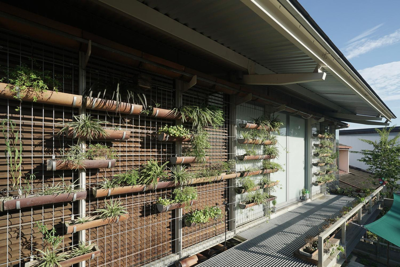 | Các giá treo cây ở mặt tiền và mặt sau có tác dụng cách nhiệt cho ngôi nhà vào những ngày hè oi bức. |