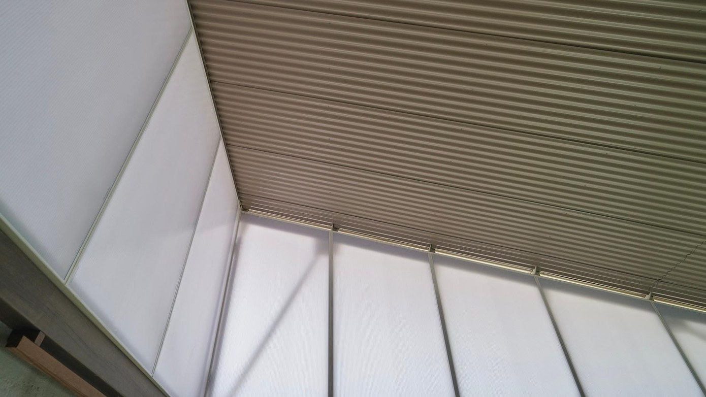 | Các phòng được ngăn cách bằng những tấm vách đôi polycarbonate (mờ và rắn) để tiết kiệm chi phí xây dựng. Nội thất trong nhà tối giản hết mức có thể. |