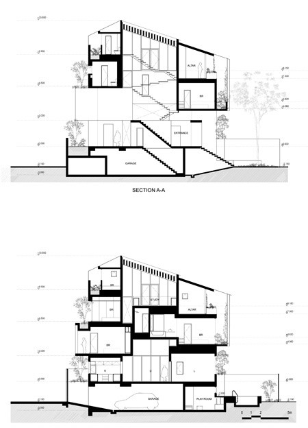Theo quy định về xây dựng, công trình được thiết kế như một biệt thự bán liên kết với hệ thống mái dốc, một mặt giáp với nhà bên cạnh, mặt còn lại lùi vào 2 m cho không gian vườn.