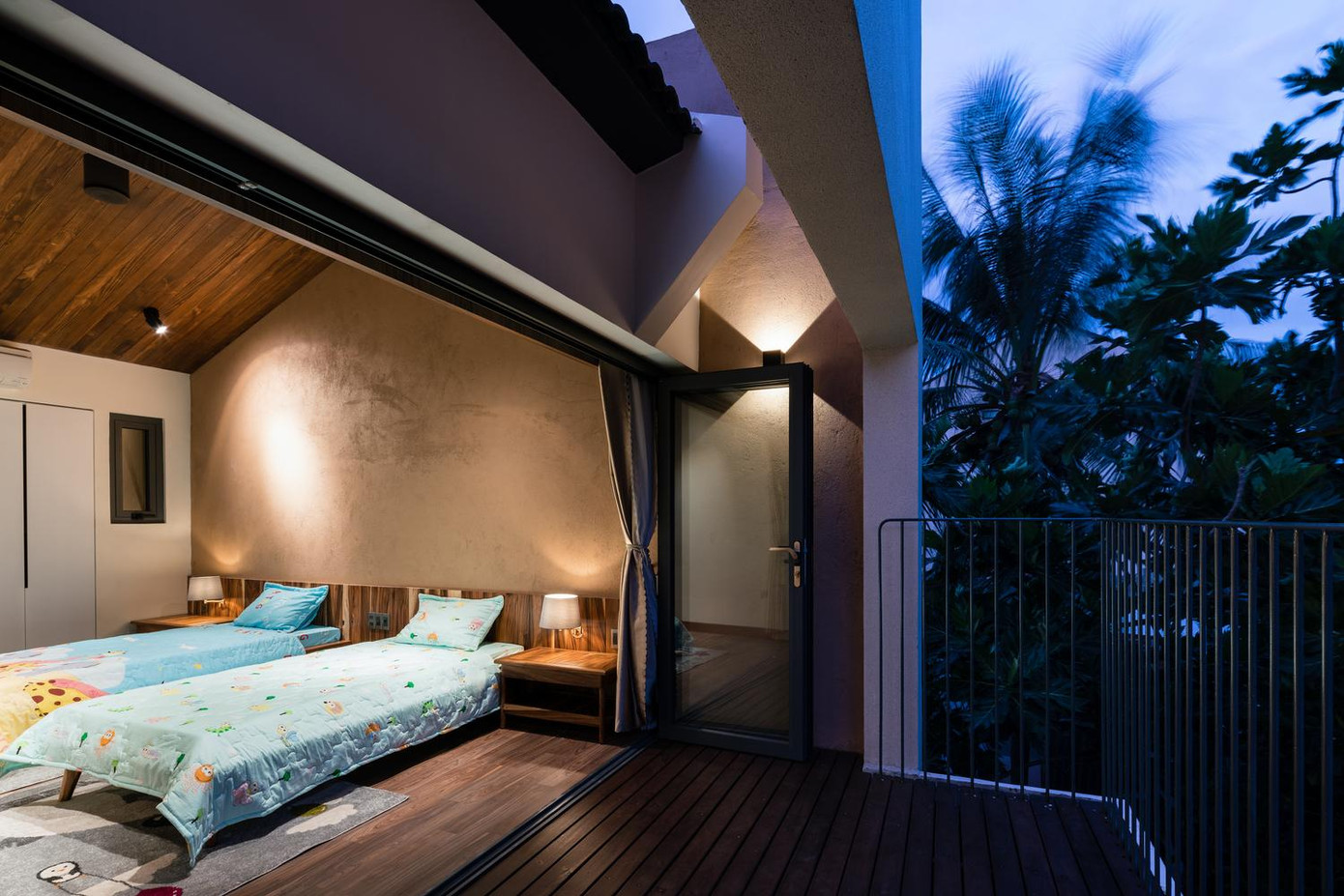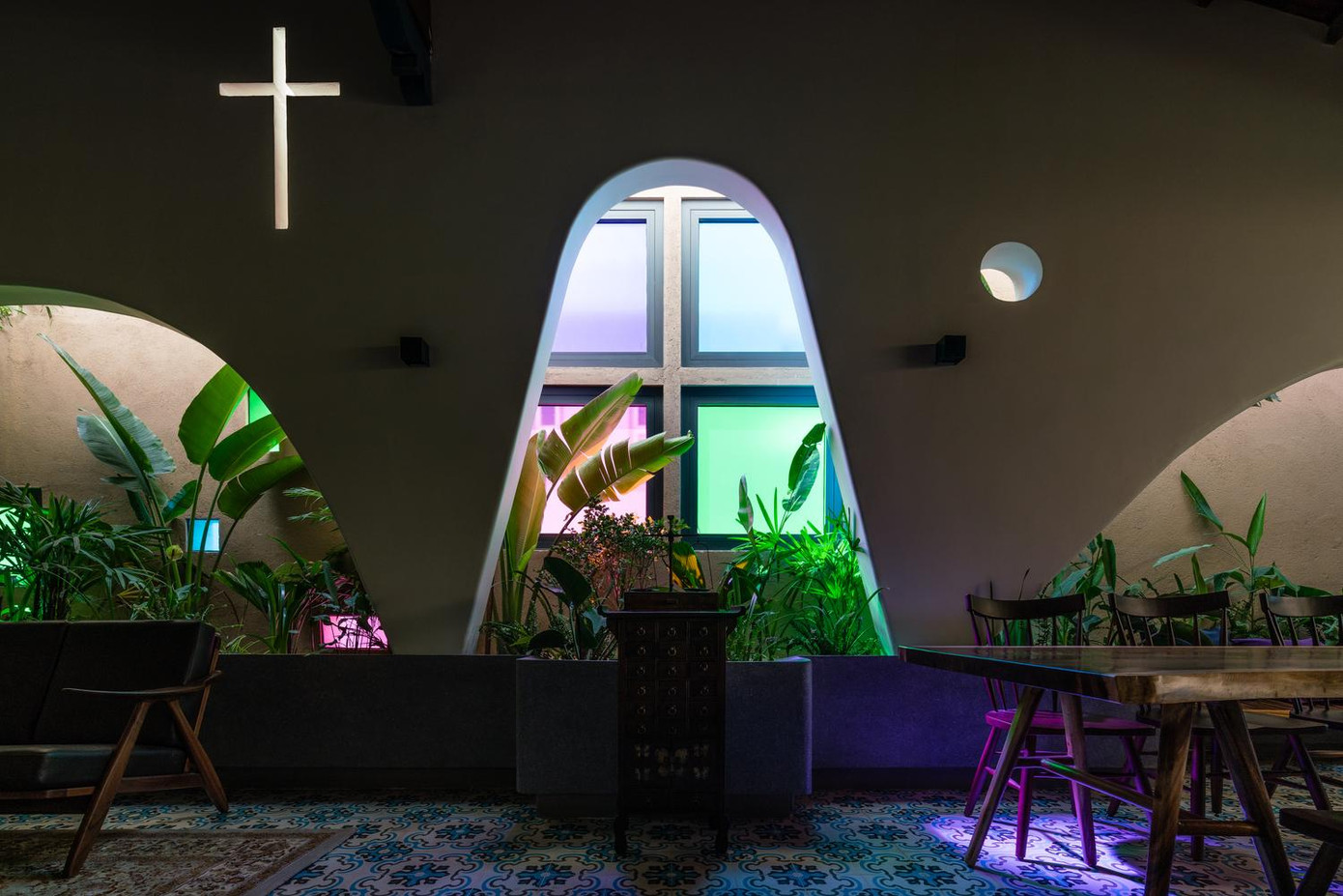 | Mặt trước của tầng 2 là phòng bếp, phòng ăn, phòng khách và phòng vệ sinh. Phía sau là hai phòng ngủ có phòng vệ sinh riêng.  | | Xen kẽ giữa các không gian là những khoảng nhỏ trồng cây xanh, đem lại sự thư giãn cho người ở. |  | | Sự đặc biệt của ngôi nhà là đan xen nét hiện đại và truyền thống với nhau thể hiện ở phần mái ngói có cột kèo và sàn gạch hoa văn giữa những cấu trúc hiện đại. |  | | Đồng thời, vì chủ nhà là người Công giáo nên các chi tiết liên quan đến nhà thờ hoặc cây thánh giá được nhấn mạnh trên bức tường lớn với cửa sổ kính màu, ánh sáng và mái vòm. Tất cả kết hợp với ánh sáng mặt trời để tôn vinh một không gian tâm linh và huyền bí. | |