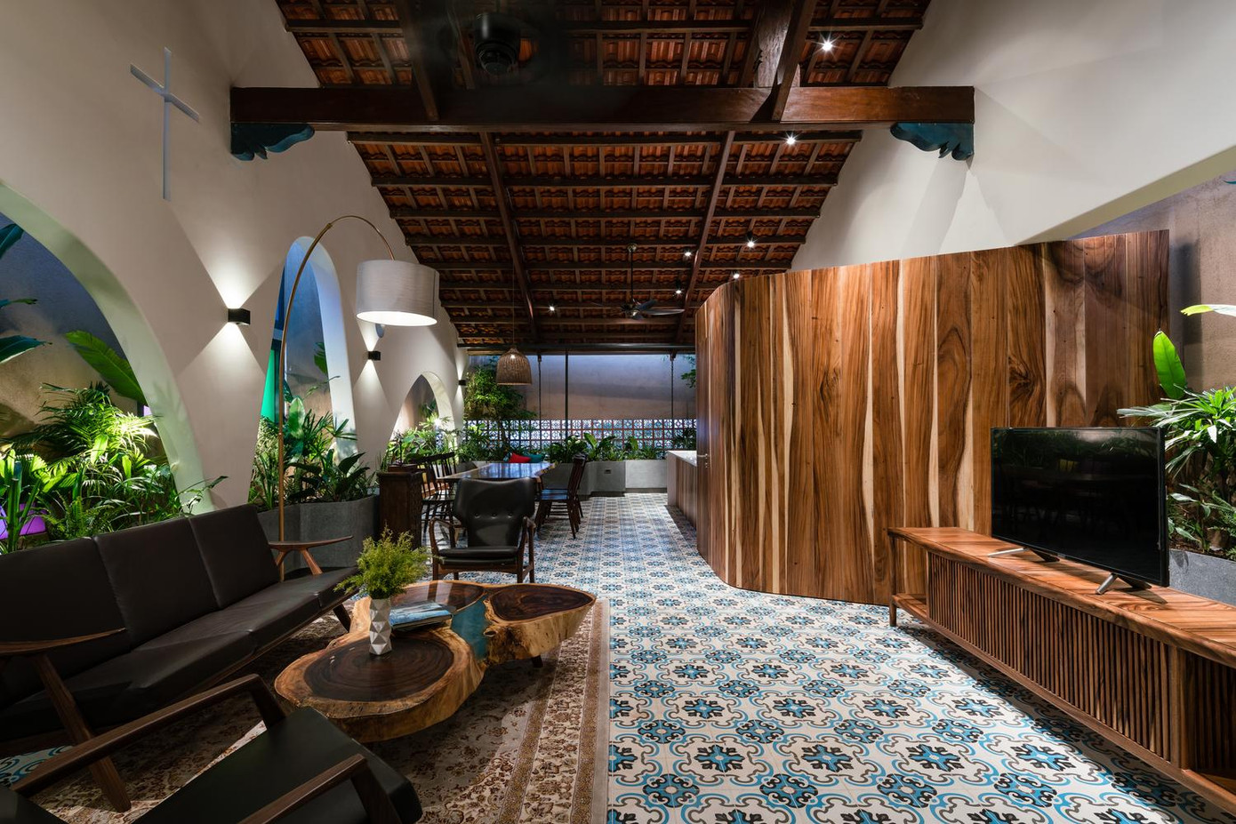 TPO - Sự đặc biệt của ngôi nhà là đan xen nét hiện đại và truyền thống với nhau thể hiện ở phần mái ngói có cột kèo cùng sàn gạch hoa văn giữa những cấu trúc hiện đại.