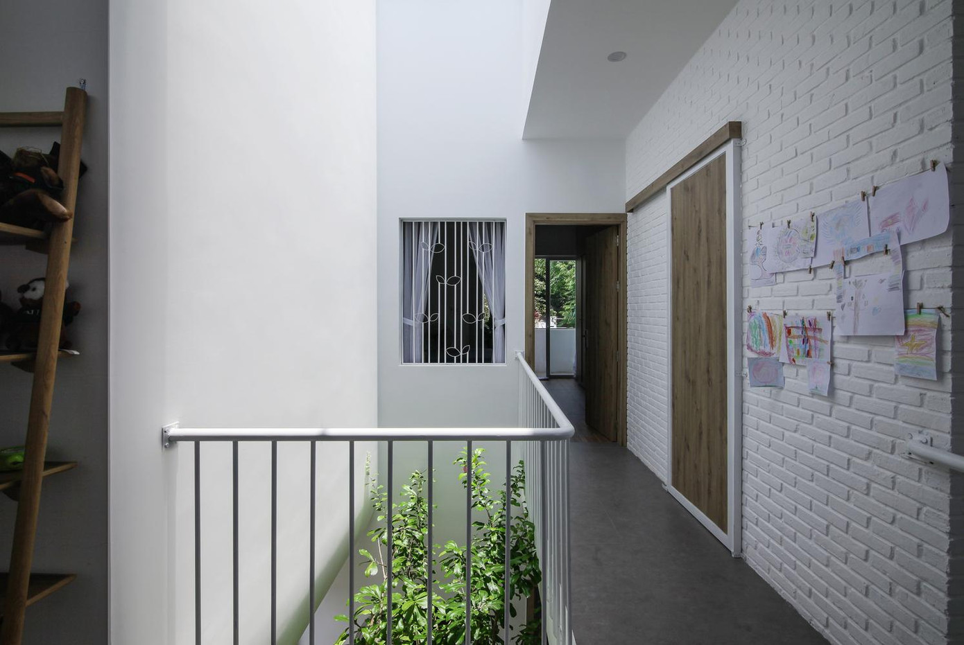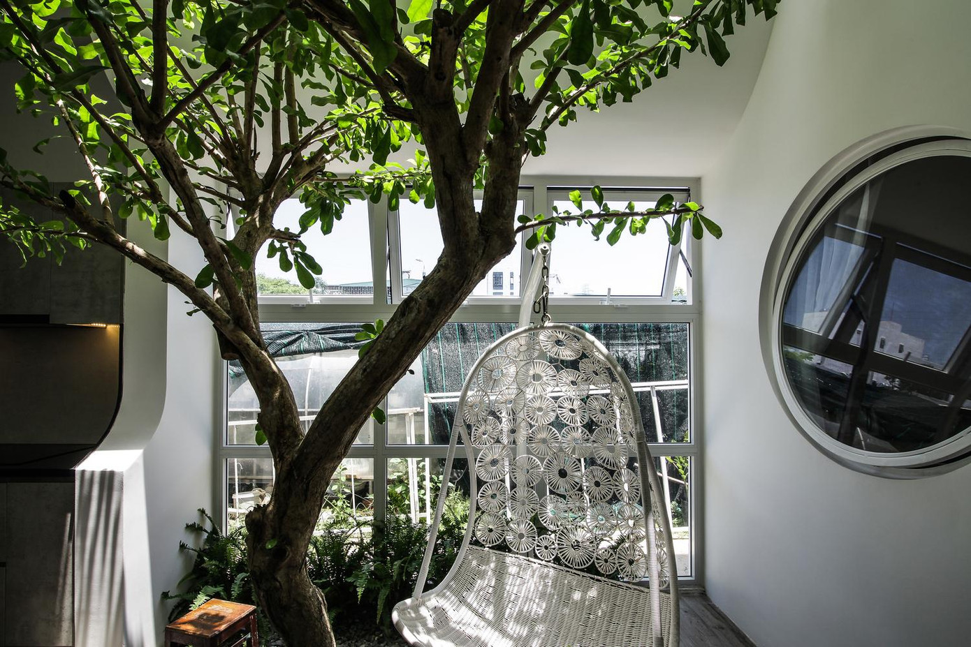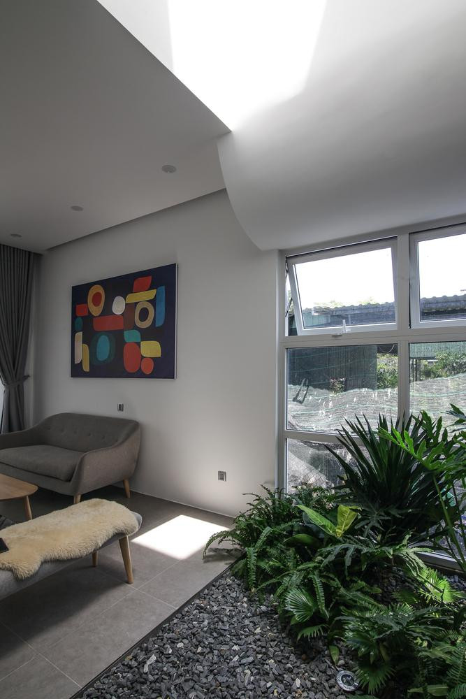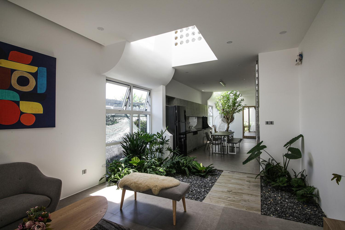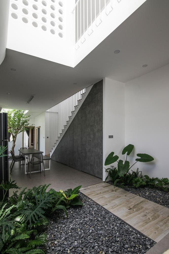 | Ý tưởng về dòng chảy cũng được các KTS nhấn mạnh trong thiết kế nội thất. Ngôi nhà có sự liên kết của 3 khu vườn nhỏ - một điểm nhấn xanh nổi bật trên tông trắng chủ đạo của ngôi nhà, tạo thêm không gian xanh mát. |