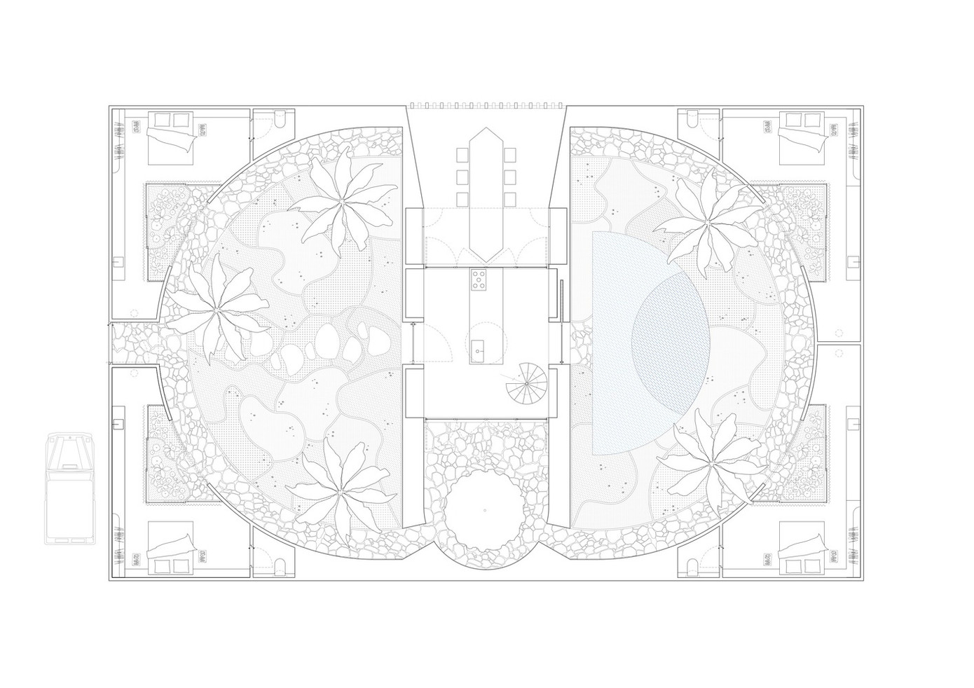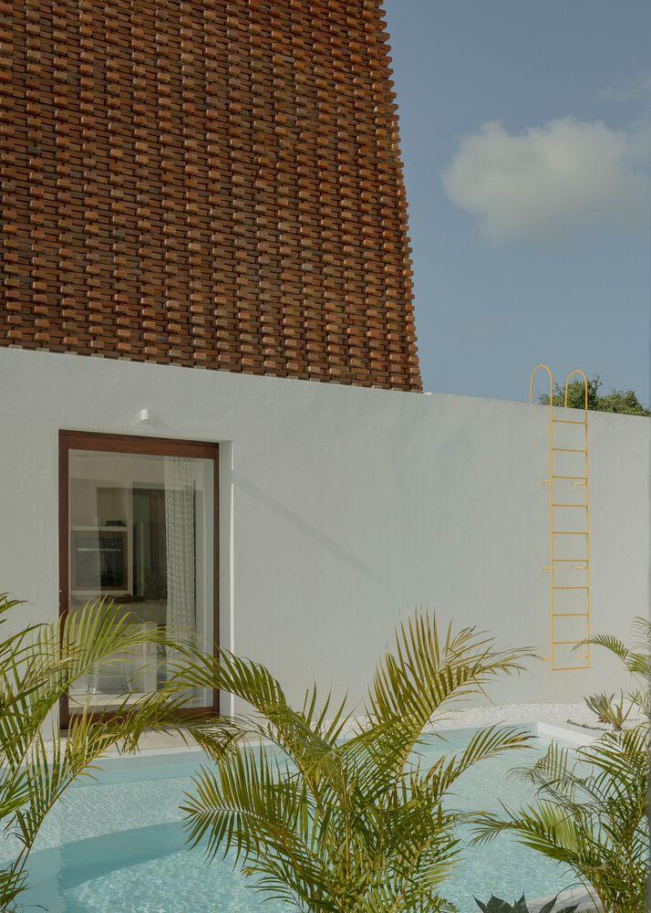 Dưới ngọn tháp trung tâm được xây bằng gạch mộc đỏ tươi lần lượt là sân thượng với bể bơi, phòng ngủ ở tầng 3, tầng 2 là phòng khách, cuối cùng là nhà bếp và khu ăn uống ở tầng trệt.