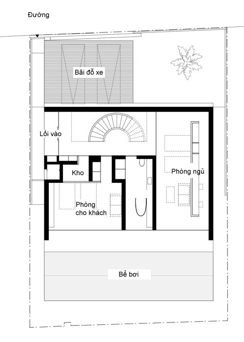 Ngôi nhà có bố trí ngược so với quan điểm thông thường khi không gian nghỉ ngơi nằm ở tầng một. Từ phòng ngủ, các thành viên trong nhà có thể bước thẳng ra bể bơi bên ngoài.