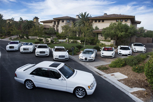 Tờ Businessinsider ước tính giá trị bộ sưu tập siêu xe của Mayweather khoảng 6 triệu USD. Theo bức ảnh, tính từ trái sang gồm Ferrari 599 GTB Fiorano (350.000 USD), Porsche 911 Turbo Cabriolet (170.000 USD), Lamborghini Aventador (400.000 USD), Ferrari 458 Spider màu trắng (260.000 USD), Ferrari 458 Spider màu xanh (260.000 USD), Bugatti Veyron Grand Sport (1,9 triệu USD), Bugatti Veyron màu trắng (1,3 triệu USD) và Bugatti Veyron màu đỏ (1,3 triệu USD). Ngoài ra là chiếc máy bay riêng hiệu Gulfstream GIII giá 2 triệu USD.