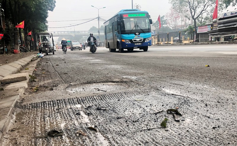 Mặt đường Ngọc Hồi cũng bị cào trên diện rộng nhưng chưa kịp thảm lại lớp nhựa mới trong đêm, khiến phương tiện đi lại ban ngày gặp nhiều khó khăn.