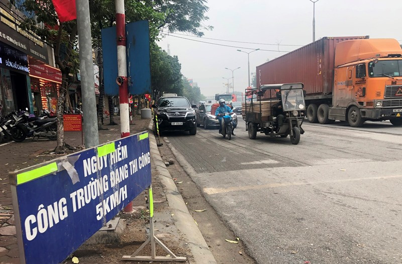 Do mặt đường nhấp nhô do bị cào bóc lớp nhựa cũ, phương tiện đi lại cũng bị các biển báo khống chế 5km/h nên ùn tắc trên đường Ngọc Hồi những ngày qua luôn xảy ra.