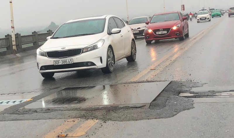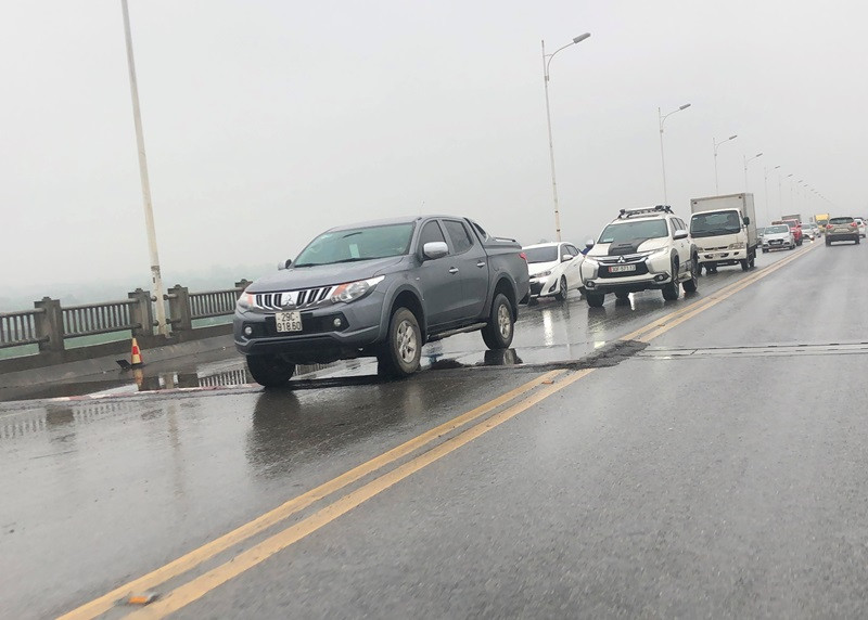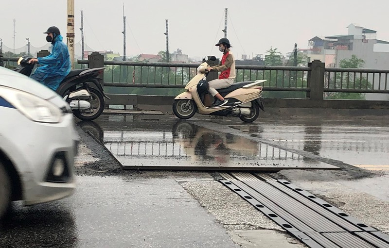 Sáng 17/3, có mặt trên cầu Vĩnh Tuy PV Tiền Phong ghi nhận, tại chiều đường hướng Long Biên - Hà Nội đang sửa chữa khe cho giãn có nhiều đoạn sửa chữa chưa xong. Do việc thi công chỉ được phép diễn ra về đêm nên sáng ra đơn vị thi công đã dùng những tấm thép bản lớn che đậy tạm. Được đậy trên gờ bê tông nhựa nên cạnh những tấm theo này thường cao hơn mặt đường từ 5 đến 10cm, gây nhô cao không êm thuận, thậm chí có tấm thép cạnh góc nhọn còn trồi lên rất nguy hiểm.