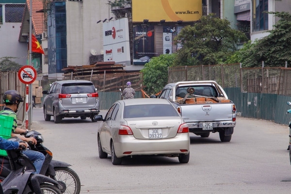 Mặc dù có biển công trình nhưng nhiều phương tiện vẫn cố tình đi vào đường dưới đê thay vì đi vào phố Yên Phụ.