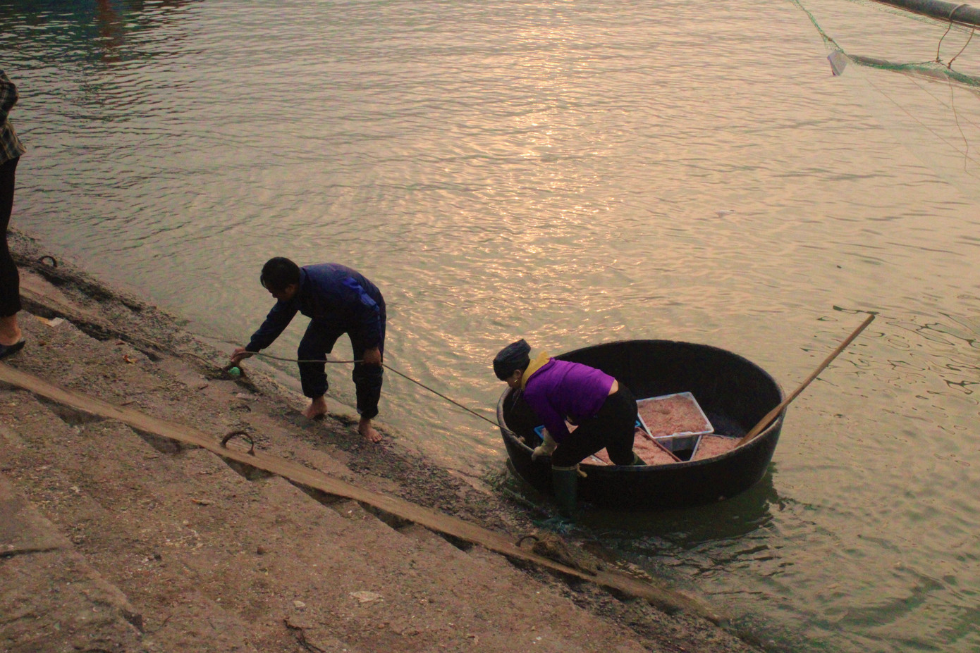 Người dân sử dụng thuyền thúng để đưa ruốc vào cảng.