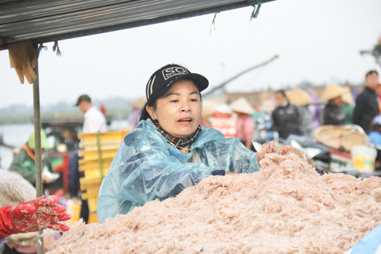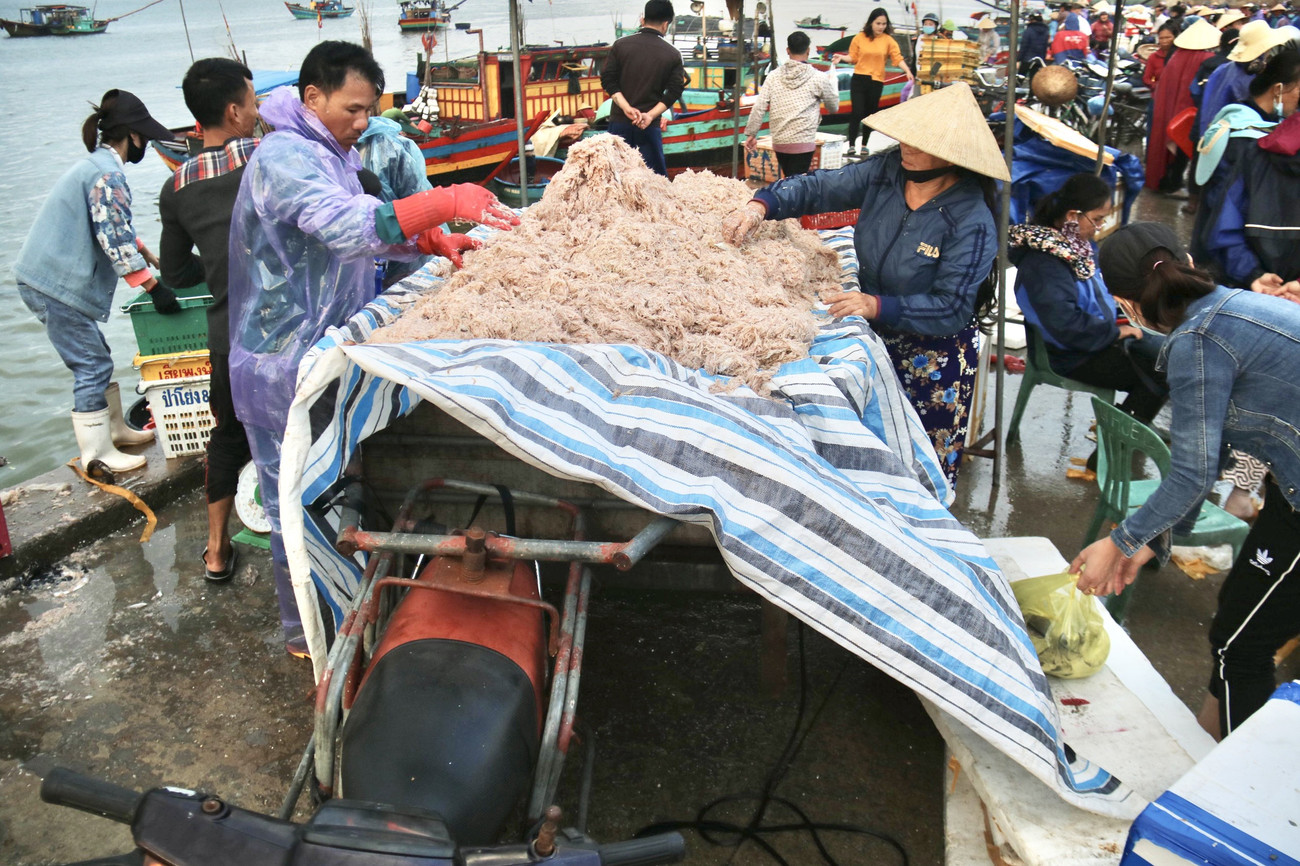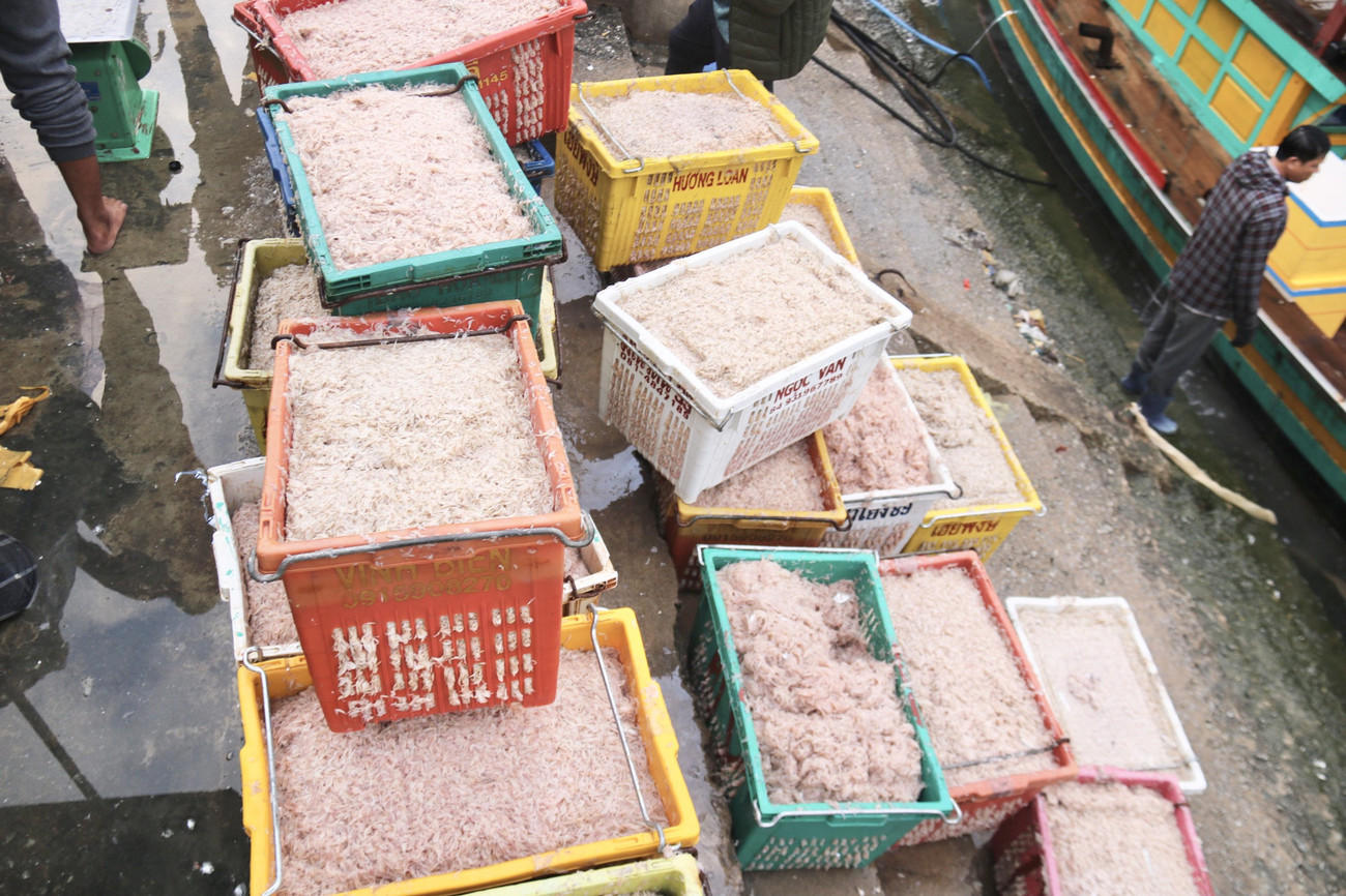 Từ khoảng 6h sáng, sau khi thuyền trở về, ngư dân cùng thương lái tập nập để vận chuyển ruốc biển lên bờ để thu mua