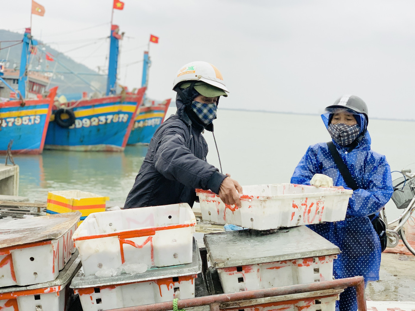 Những mối buôn xếp hàng đợi tàu vào để thu mua cá, họ chuẩn bị những vật dụng dùng để trữ cá..