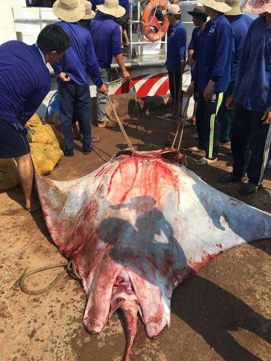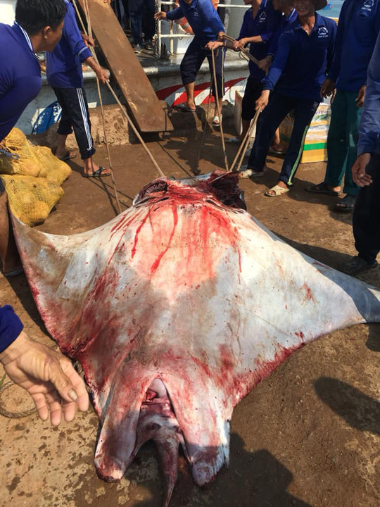 Ngư dân Dương Hợp cho biết: Tối 5/5, sau khi thả lưới buông câu tại ngư trường ven đảo để hành nghề lưới nổi, đến rạng sáng ngày 6/5, khi chuẩn bị thu lưới trở về bờ, ông và các ngư dân đi trên tàu phát hiện 2 con cá đuối rất lớn dính lưới.