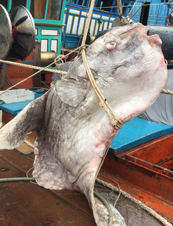 Theo đó, khi đang đánh bắt cá ở vùng biển Vịnh Bắc Bộ, cách bờ khoảng 70 hải lý, tàu cá NA -9000-TS do anh Đào Văn Huân (Trú tại xã Quỳnh Long, Quỳnh Lưu) làm thuyền trưởng phát hiện một con cá to mắc lưới. Các thuyền viên đã dùng máy tời để kèo cá lên. Khoảng 1 tiếng đồng hồ thì con cá mới được đưa lên khoang thuyền. Mọi người nhận biết đây là cá mặt trăng có đường kính dài khoảng 2,5m và nặng khoảng gần 1 tấn.