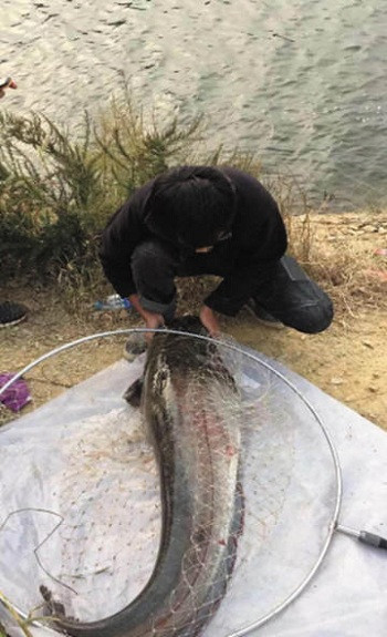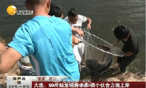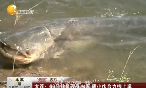 Anh Cao, người dân thành phố Đại Liên, tỉnh Liêu Ninh, Trung Quốc, bắt được con cá nheo nặng gần 60 kg tại hồ chứa nước Tây Sơn hôm 26/9, Sina đưa tin.