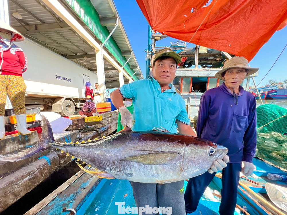 | “Chuyến biển xuyên Tết này, tàu đánh bắt được gần 20 tấn cá các loại. Trong đó, có 10 tấn cá ngừ sọc dưa, 40 con cá ngừ đại dương (từ 20-40 kg/con), 1 tấn cá thu... Chuyến biển này, tàu của tôi thu về khoảng 400 triệu đồng, trừ phí tổn còn lời gần 300 triệu đồng. Mỗi bạn thuyền sẽ được chia tiền công khoảng 15-20 triệu đồng”, ông Định bộc bạch. |