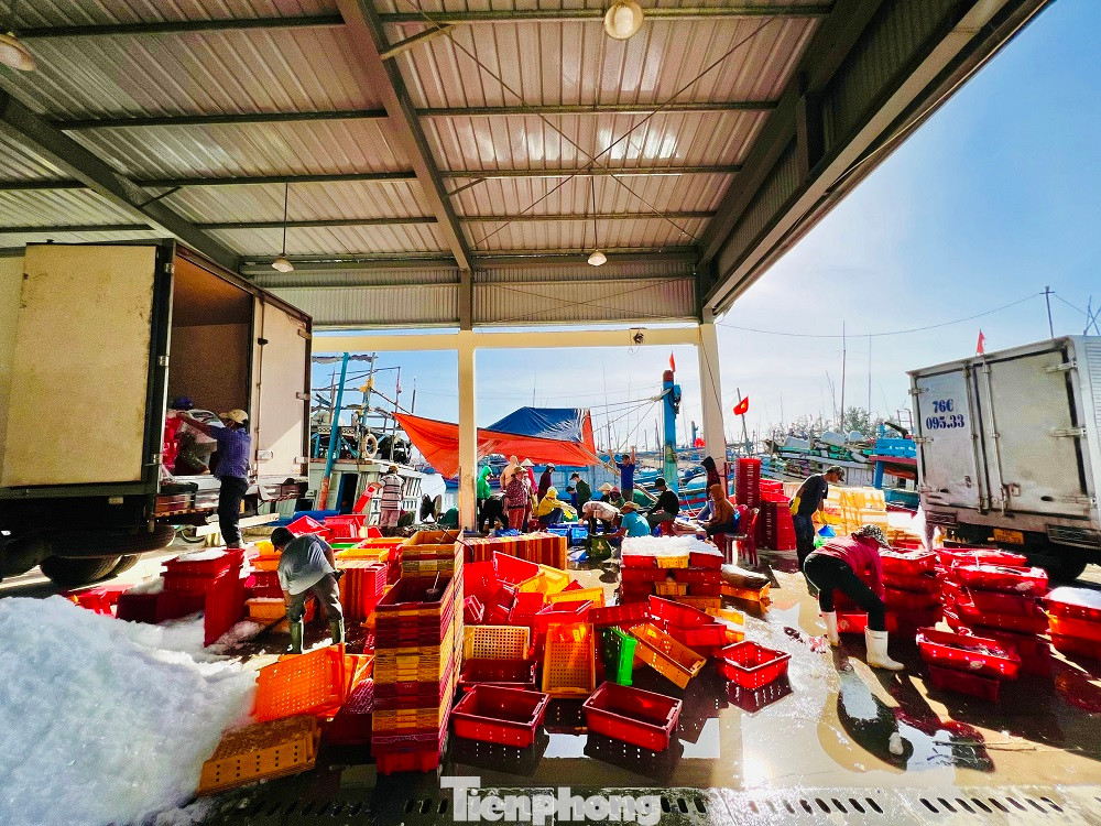 | Liên tục trong những ngày qua, hàng loạt tàu cá của ngư dân Quảng Ngãi đánh bắt xuyên Tết hối hả, nối đuôi nhau từ ngư trường Hoàng Sa, Trường Sa trở về cập cảng, mang theo hàng chục tấn hải sản có giá trị, bán cho thương lái thu về hàng trăm triệu đồng. |