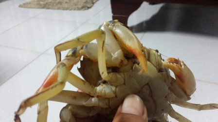 Do có tới 3 chiếc càng nên khi thả ra, con cua bò thì 2 càng quay về trước còn 1 càng quay sang bên hông.