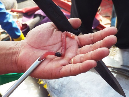 Thương lái kiểm tra thịt cá ngừ đại dương ở cảng cá Hòn Rớ, Nha Trang bằng cách làm thủ công.