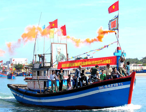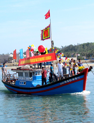 Sau hồi trống khai hội rộn ràng, từng đoàn tàu của ngư dân vùng cửa biển Sa Huỳnh, huyện Đức Phổ và ngư dân huyện đảo Lý Sơn trang hoàng băng rôn, ảnh bác Hồ, treo cờ Tổ quốc tung bay, thẳng tiến ra khơi vào đầu xuân mới. Các ngư dân còn cầm đuốc nhuộm màu nghi ngút khói mang ước vọng lễ ra quân đánh bắt thủy sản đầu năm mang lại nhiều may mắn, tôm cá đầy khoang