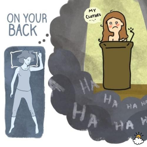 Nghiên cứu cho rằng khi nằm ngửa, bạn thường mơ thấy mình rơi vào tình huống chơi vơi, cảm thấy như mình đang bị phơi bày, bị lật tẩy, nhạo báng... Chẳng hạn như bạn mơ thấy mình đến trễ giờ thi hoặc "tồng ngồng" mà chạy ra đường. Đây có thể xem là ác mộng. Người nằm ngửa cũng khó mà nhớ được giấc mơ của mình, điều này hóa ra lại tốt vì họ chỉ toàn gặp ác mộng thôi.