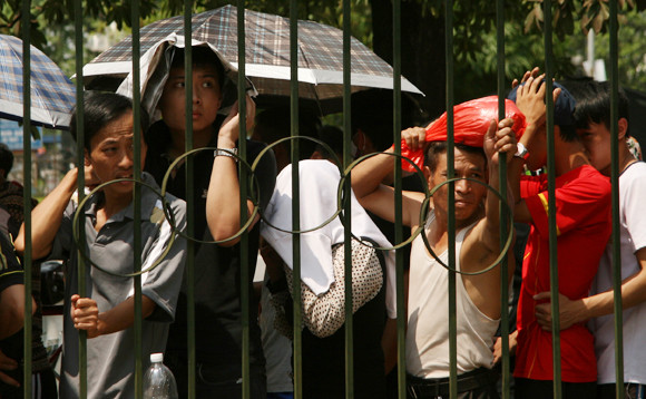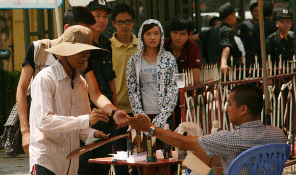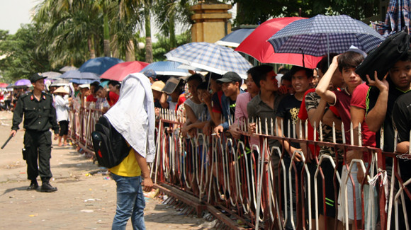 Bất chấp cái nắng gần 40 độ C tại Hà Nội, hàng ngàn người đã đội nắng xếp hàng nhiều giờ tại các quầy bán vé, chờ đợi để đến lượt vào mua vé giải U19 Đông Nam Á.