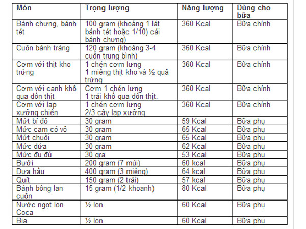 Bảng ví dụ lượng thực phẩm cho một bữa chính và bữa phụ cho người béo phì và đái tháo đường: Tính cho thực đơn 1.200 Kcal, bữa chính nên chiếm 30% tức khoảng 360 Kcal, bữa phụ nên chiếm 5% tức khoảng 60 Kcal.