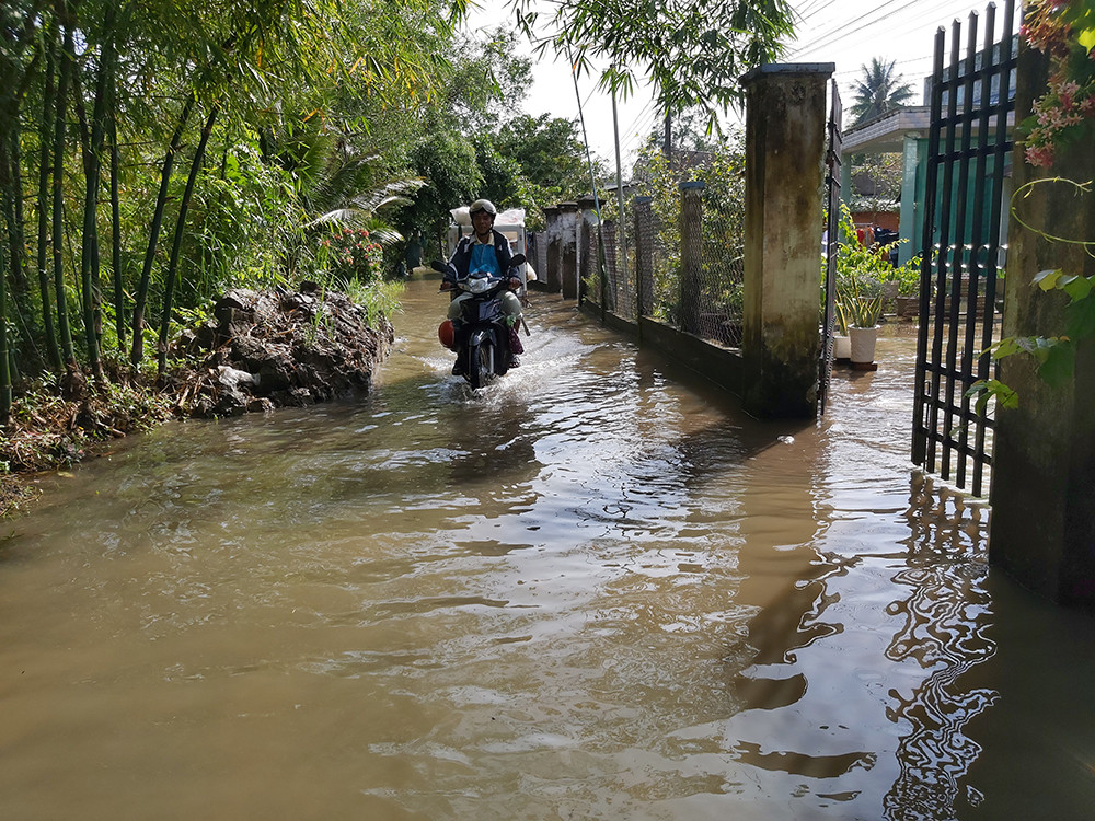 nước tràn qua lộ nông thôn ở Hậu Giang ẢNH: HÒA HỘI Còn tại xã Long Thạnh (Phụng Hiệp, Hậu Giang) ông Nguyễn Văn Thanh và ông Nguyễn Thanh Tiền ở ấp Long Hòa A2 cũng thức canh bơm nước để bảo vệ hơn 1 ha chanh.