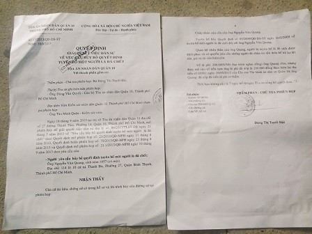 Ngày 18/9/2013, TAND quận 10 huỷ quyết định cũ và ra quyết định mới ghi rằng: “Quan hệ nhân thân của ông Quang, người bị tuyên bố đã chết được khôi phục và có quyền yêu cầu những người đã nhận tài sản thừa kế trả lại tài sản, giá trị tài sản hiện còn”.