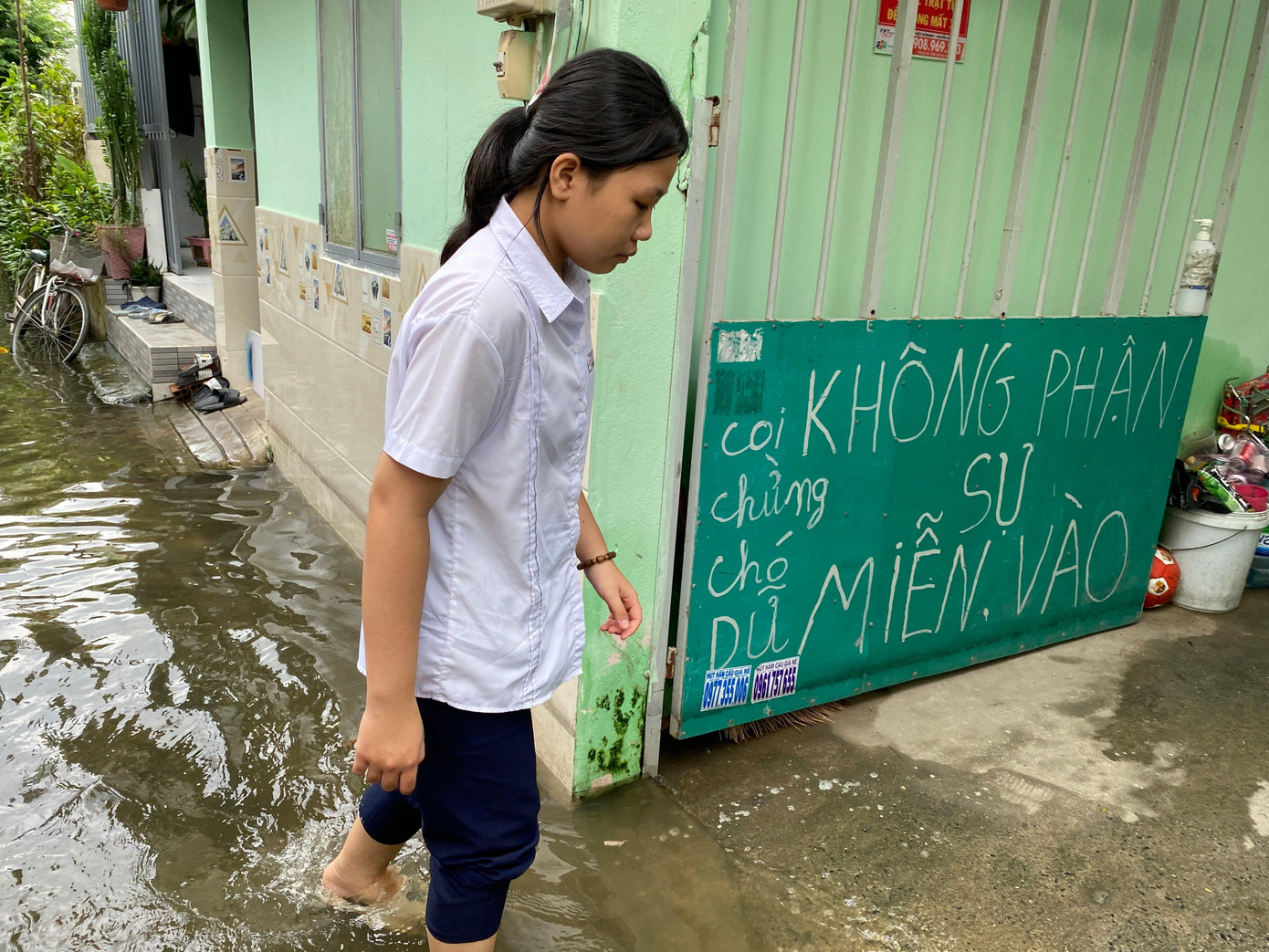 | Nước ngập liên tục nên người dân phải dùng dây buộc thùng rác để tránh bị trôi mất. Ảnh ghi nhận tại hẻm 17 đường Tam Bình. |