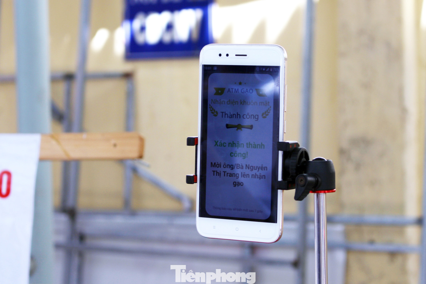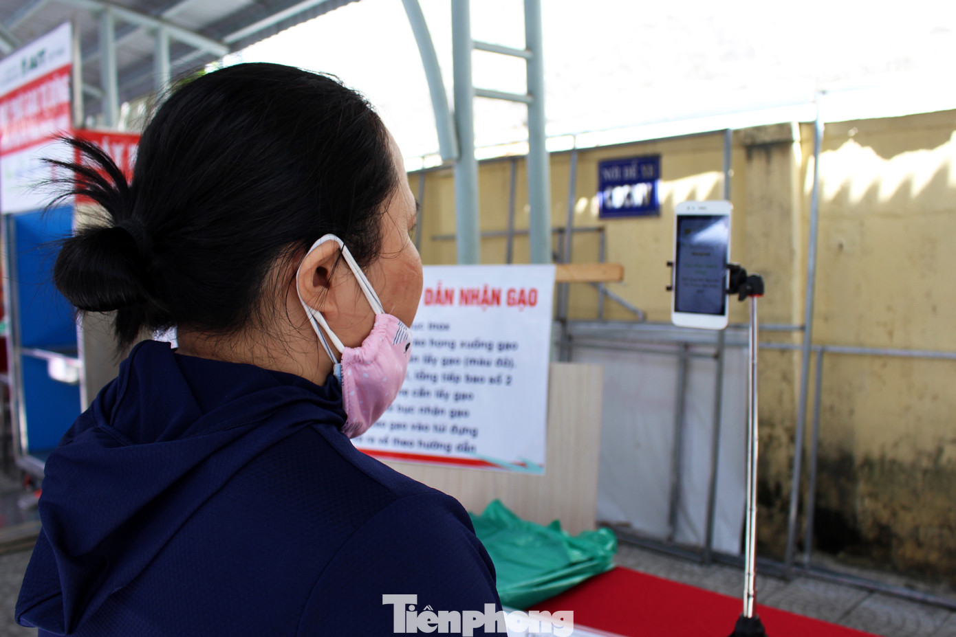 Sau khi rửa tay sát khuẩn, người dân tiến vào khu vực bố trí sẵn điện thoại thông minh, tháo khẩu trang và ấn nút để nhận diện khuôn mặt. Nếu máy nhận diện đúng người dân cần được hỗ trợ sẽ có thông báo "Thành công". Người dân có thể tiến sang khu vực nhận gạo. Ảnh: Giang Thanh