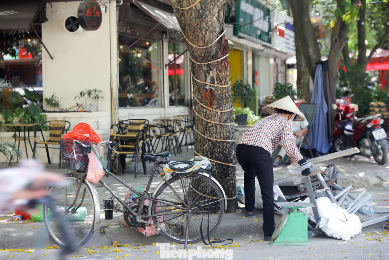 Dưới bóng cây xanh râm mát, cô Q bán đồng nát vẫn miệt mài cân đo những món hàng vừa mua gom được.