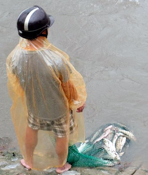 Không chỉ dùng cần câu hay vợt, nhiều người còn mang cả vó ra sông để bắt cá.