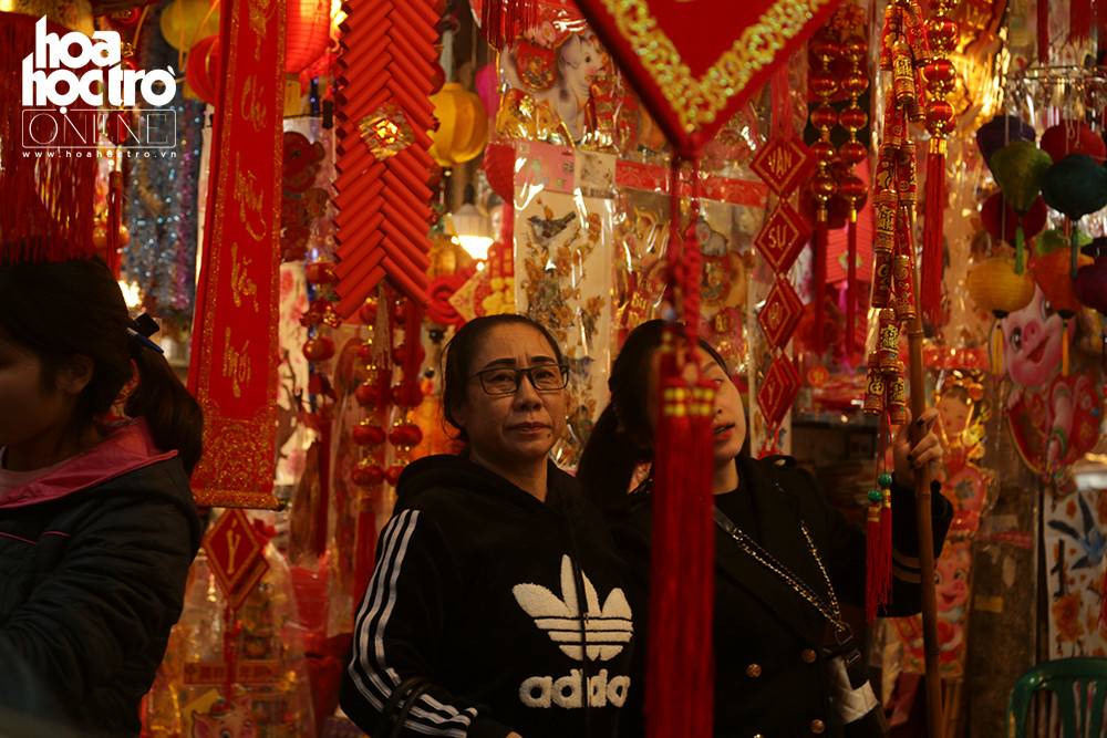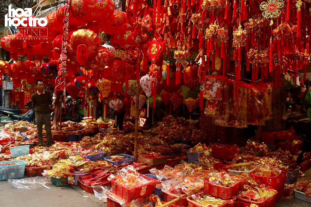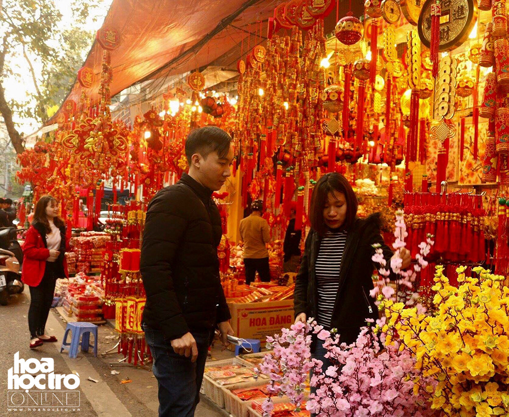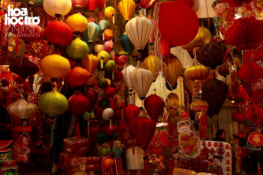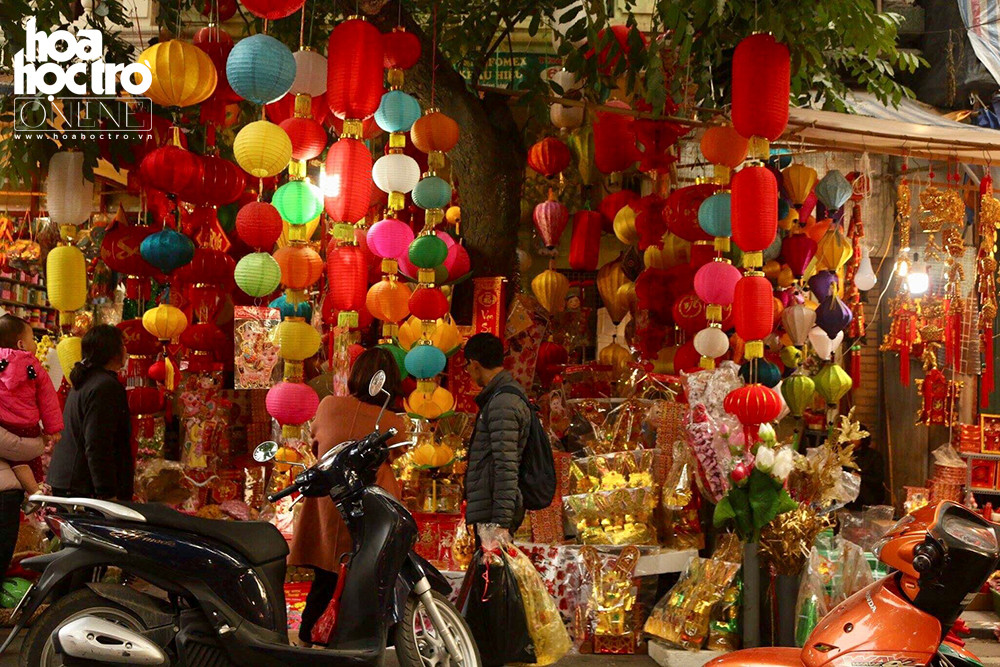 Những cửa hàng, cửa hiệu bày bán rất nhiều mặt hàng phục vụ nhu cầu mua sắm Tết của người dân như: đèn lồng treo tết, hoa quả, khăn lụa, đồ gốm sứ...
