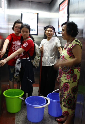 Vừa trông cháu, chốc chốc bà Thủy (54 tuổi), sống ở chung cư B2 lại chạy về phía bể nước dưới sân để ngó nước chảy. Khi nghe tiếng máy bơm, nhiều người hai tay hai xô sẵn sàng xuống xách nước. Gia đình bà Thủy sống ở tầng 20 của tòa nhà. Cả tuần nay 3 người lớn và 2 đứa trẻ con toàn ăn hàng bởi không có nước nấu cơm. Vợ chồng con gái đi làm về là ra siêu thị mua nước về tắm hoặc phải đi tắm nhờ nhà người quen ở khu vực khác. Hai đứa cháu mới 2 tuổi và 4 tháng tuổi rôm sảy đầy người vì không được tắm thường xuyên.