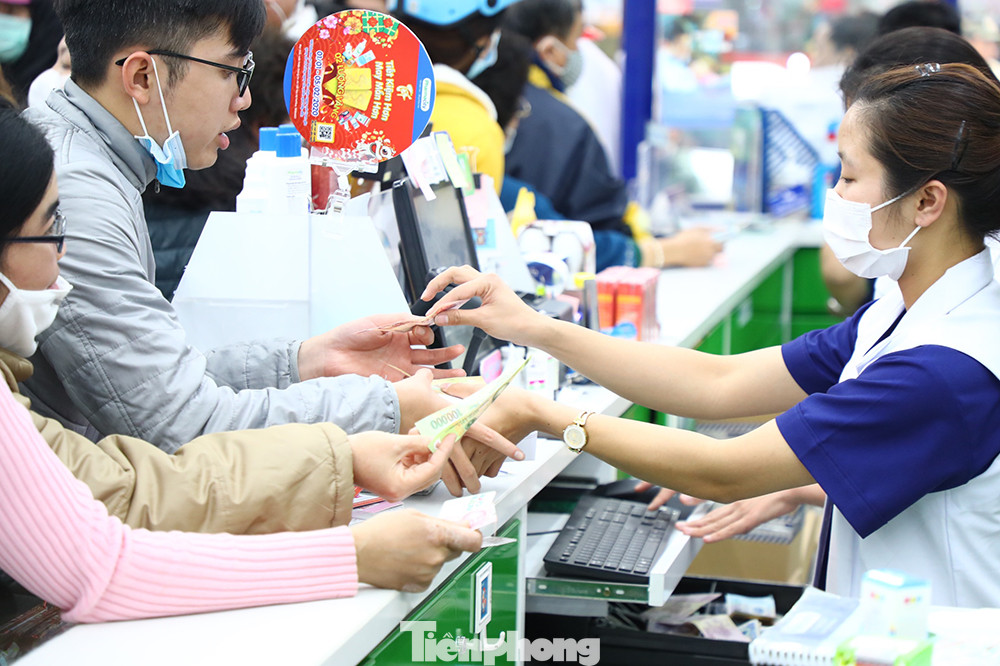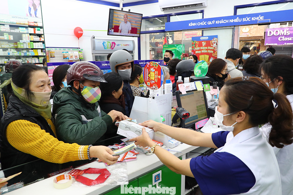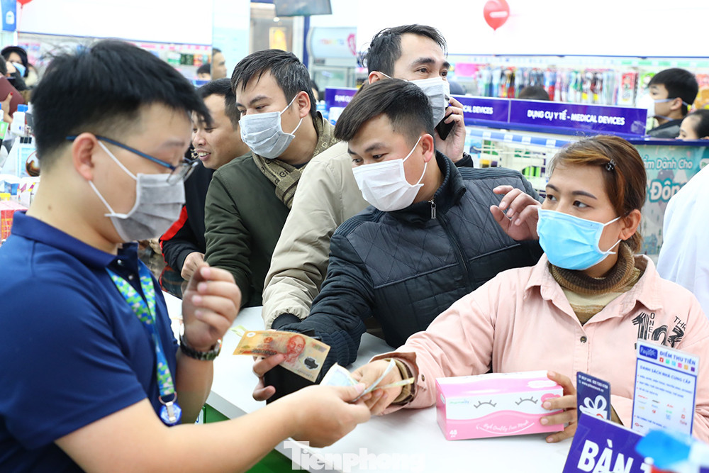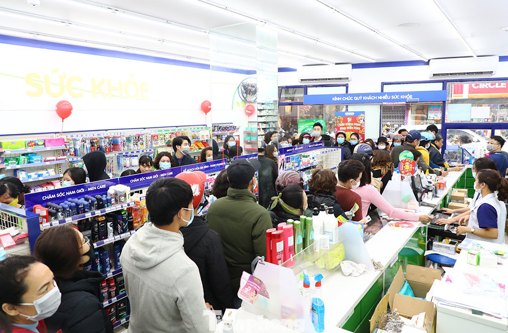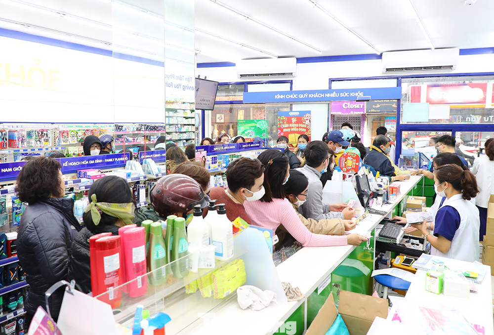 Bên trong hiệu thuốc đông kín người xếp hàng chờ đến lượt mua khẩu trang,Xếp hàng rất lâu nhưng mỗi người chỉ mua được một hộp khẩu trang vì số lượng có hạn.