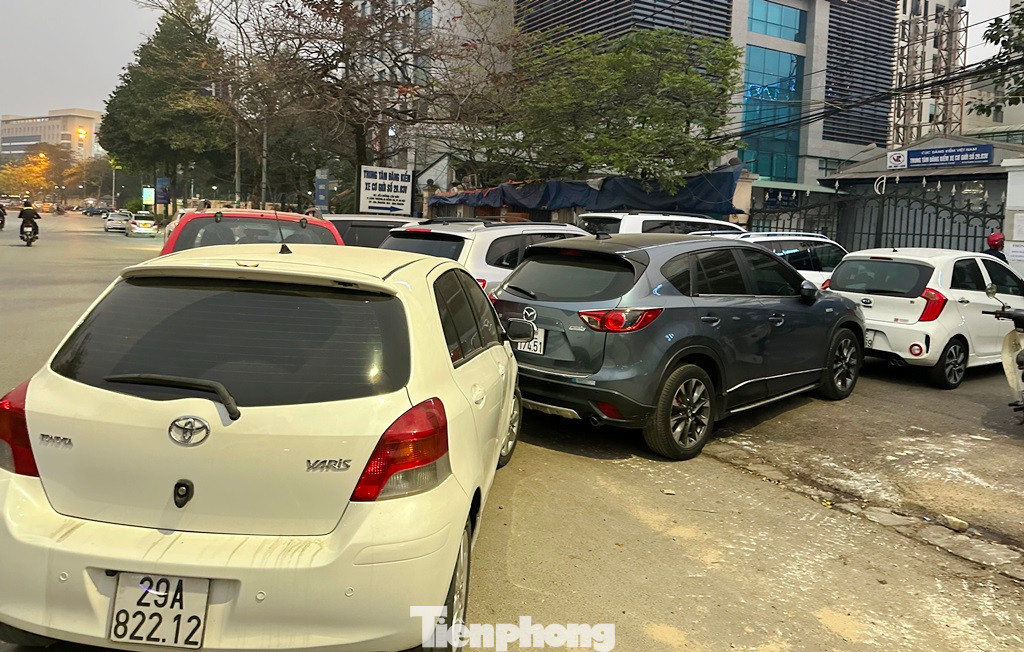 | Đến hơn 6h chiều 5/3 lượng xe xếp hàng từ cổng ra vào Trung tâm đăng kiểm Cầu Giấy kéo dài trên đường Cầu Giấy cả trăm mét. |