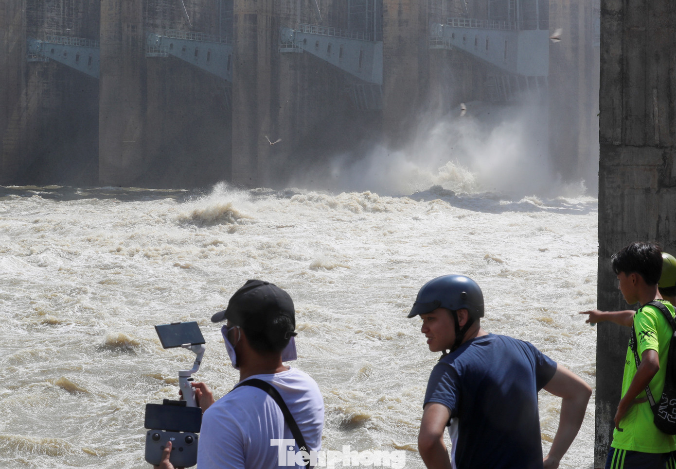 | Hàng chục người dân hiếu kỳ tới xem xả điều tiết lũ. |