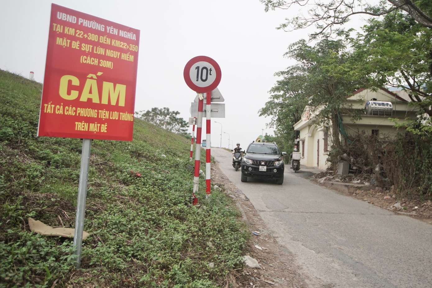 Lực lượng chức năng quận Hà Đông đã phối hợp với UBND phường Yên Nghĩa dựng biển cảnh báo từ xa, biển cấm và hệ thống rào chắn cả 2 đầu đoạn đường đê Yên Nghĩa, nơi xuất hiện điểm sụt lún.