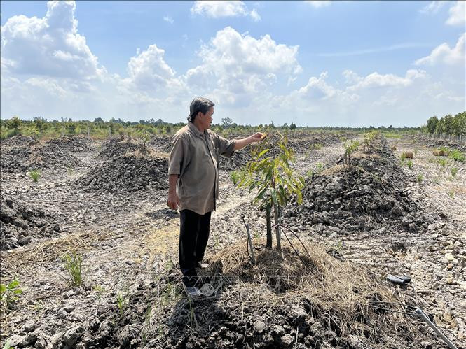 Huyện Tân Thạnh thuộc vùng Đồng Tháp Mười, hướng biên giới tỉnh Long An, người dân và chính quyền ở đây cho biết, chưa năm nào địa phương bị hạn kéo dài và xâm nhập mặn nhiều như năm nay. Hạn mặn đã bắt đầu ảnh hưởng đến cây trồng, cùng với các giải pháp thích nghi của chính quyền, người dân Tân Thạnh đang ngóng mưa lớn để kịp cứu những vườn cây ăn trái của mình.