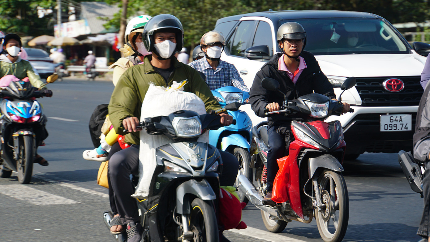 | Cả gia đình trên xe gắn máy trên đường. Ảnh: Hòa Hội |