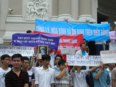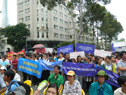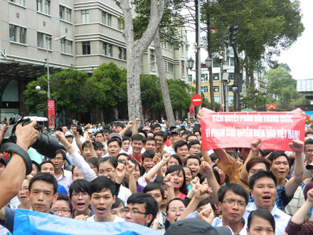 Tại TP.HCM sáng nay, hàng nghìn trí thức, sinh viên, học sinh, tiểu thương, công nhân và các tầng lớp nhân dân TPHCM và một số tỉnh, thành phía Nam đã tham gia mít tinh ôn hòa do Hội Luật gia TPHCM tổ chức, nhằm phản đối hành động sai trái, gây căng thẳng trên Biển Đông của Trung Quốc.